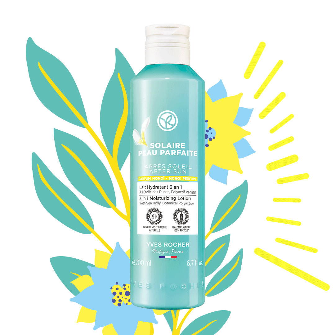 Pre neodolateľnú vôňu Monoi a okamžite upokojenú a hydratovanú pokožku odporúčame Mlieko po opaľovaní 3 v 1. S viac ako 91 % prírodných zložiek šetrne napráva negatívne dopady slnečného žiarenia.