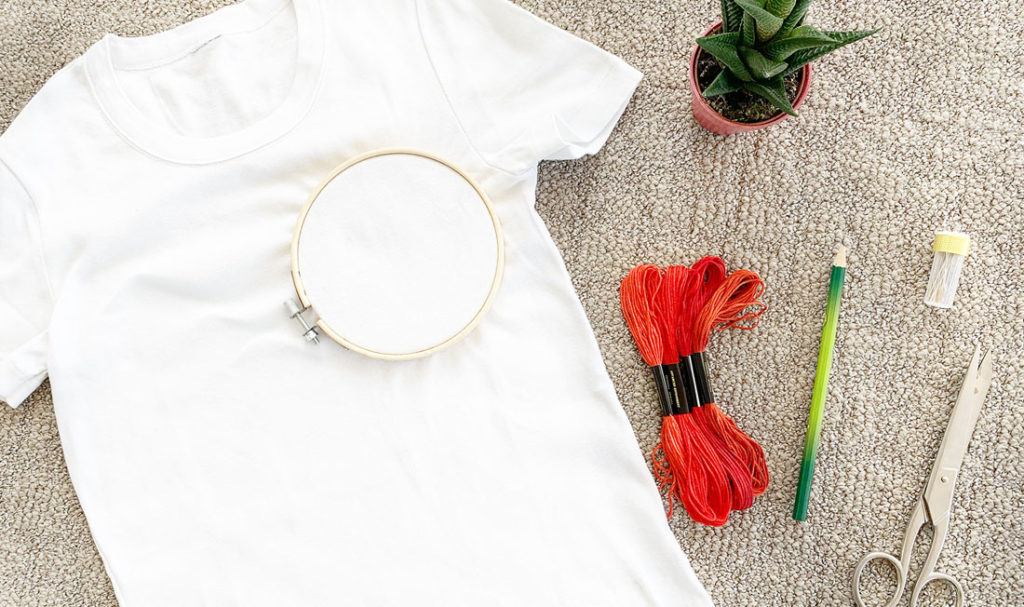 Budete potrebovať: ihlu, niť, biele tričko, vyšívací rámček, vyprateľnú fixku na textil.
