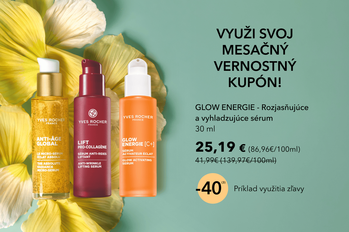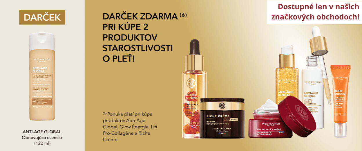 (6) Exkluzívne dostupné iba v predajniach: pri kúpe dvoch produktov starostlivosti o pleť z radov Anti-Age Global, Glow Energie, Lift-Pro Collagène alebo Riche Crème získate Regeneračnú esenciu 122 ml – za 1 cent. Nemožno kombinovať s inými ponukami.