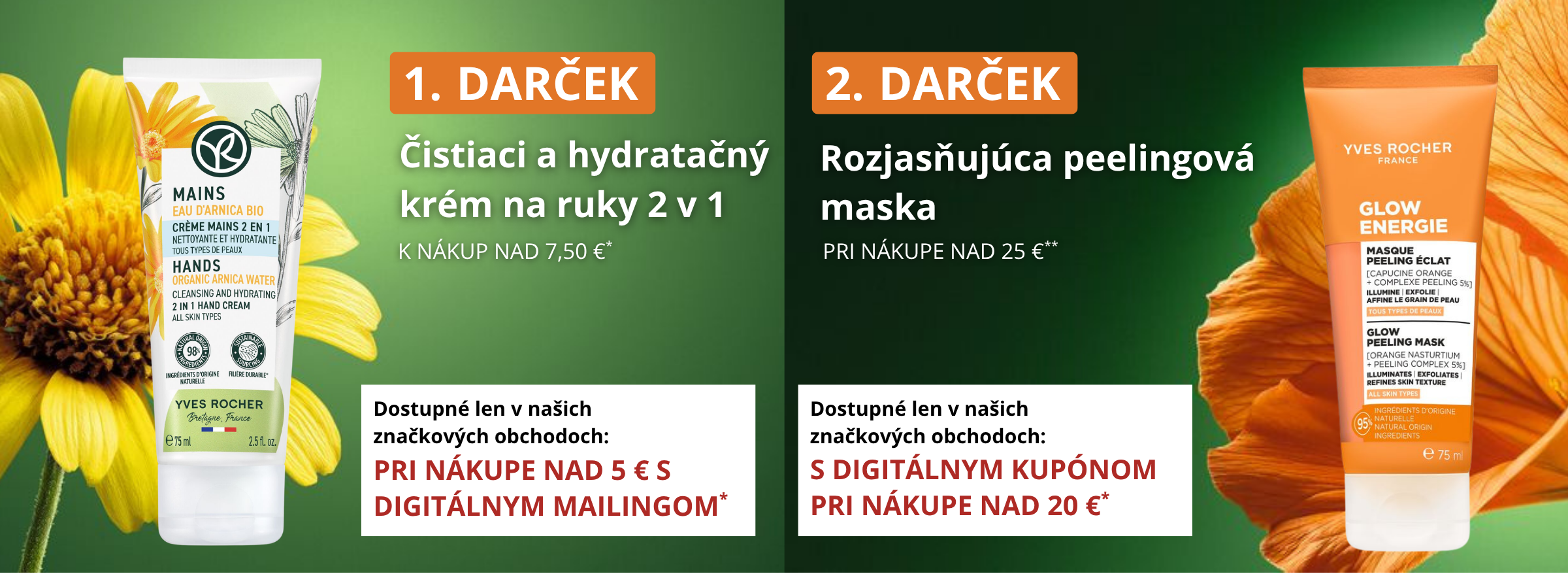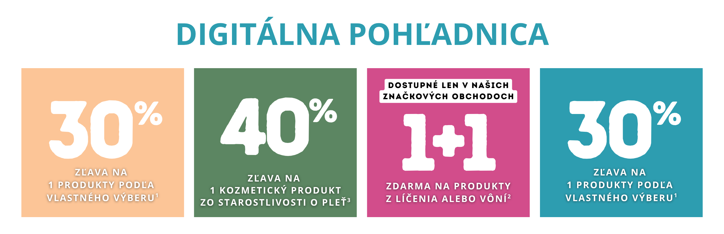 (1) 30 % zľava na 2 produkty podľa vlastného výberu. Ponuku nemožno kombinovať s inými zľavami. Nevzťahuje sa na miniprodukty, balíčky a darčekové poukážky.