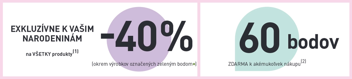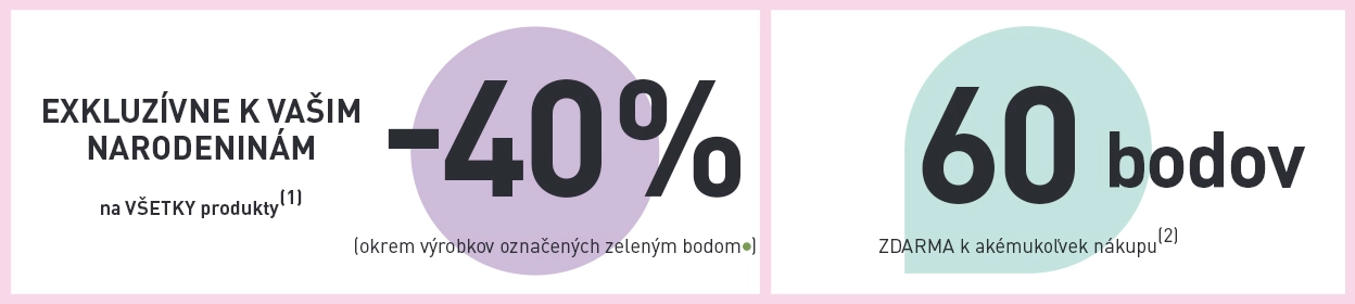 *Zľavy a ponuky sa nekumulujú. Jeden darček na zákazníka na nákup nad 4.49 €. Ponuka platí do vydania zásob. Zľava 50 % neplatí na výrobky označené zeleným bodom. Ponuku 60 bodov k akémukoľvek nákupu je možné využiť iba jedenkrát na nákup nad 4.49 €. Ponuka 2 šampónov za špeciálnu cenu sa vzťahuje iba na šampóny s katalógovou cenou 5.79 €. Darček bude vydaný vždy iba jedenkrát. Ponuka platí po dobu 1 mesiaca od doručenia. Všetky zľavy sa vypočítavajú zo základných cien pred zľavou odporúčaných od 31.1.2022 v SR. Ak využijete ponuku tohto narodeninového mailingu, nie je možné vkladať darčeky z ponuky e-shopu.
