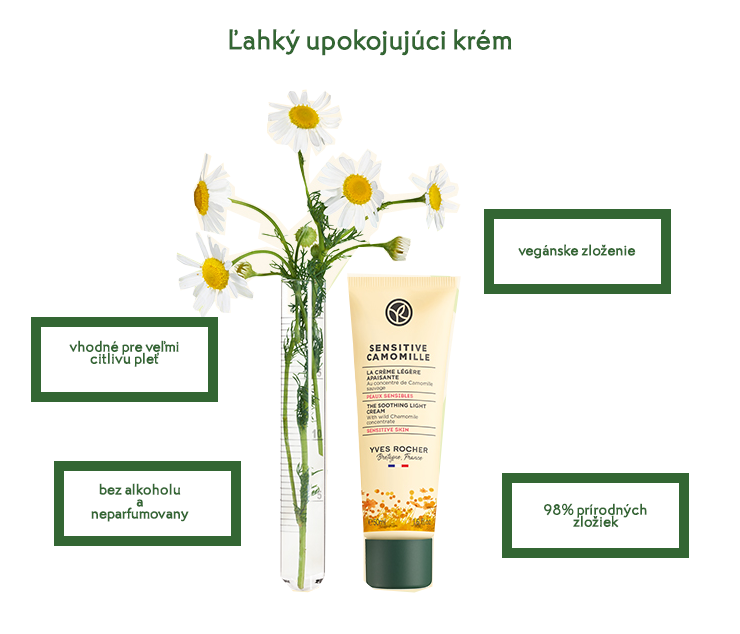 Cítite nepríjemné svrbenie a napätie pokožky pri myšlienke začať deň bez aplikácie krému? V laboratóriách Yves Rocher vieme, aké dôležité je každý deň hydratovať a upokojiť nadmerne zaťaženú pokožku. Preto sme vytvorili ľahký upokojujúci krém s príjemnou, sviežou a ľahko vstrebateľnou konzistenciou, vďaka ktorému bude Vaša pokožka okamžite hydratovaná.