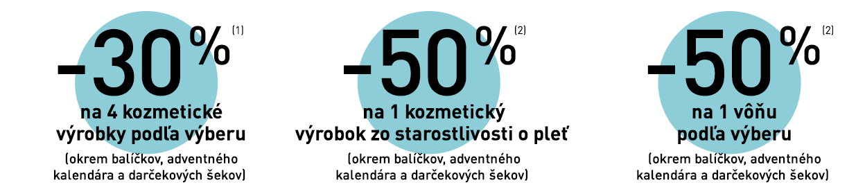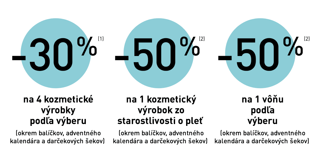 (1) Zľavy a ponuky sa nekumulujú. Ponuka sa nevzťahuje na balíčky, adventný kalendár a darčekové šeky.