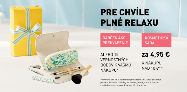 **Zľavy a ponuky sa nekumulujú. Jedna Kozmetická sada za 4,95 € k nákupu nad 10 € na zákazníka. Ponuky platia do vydania zásob. Zmena darčekov vyhradená.