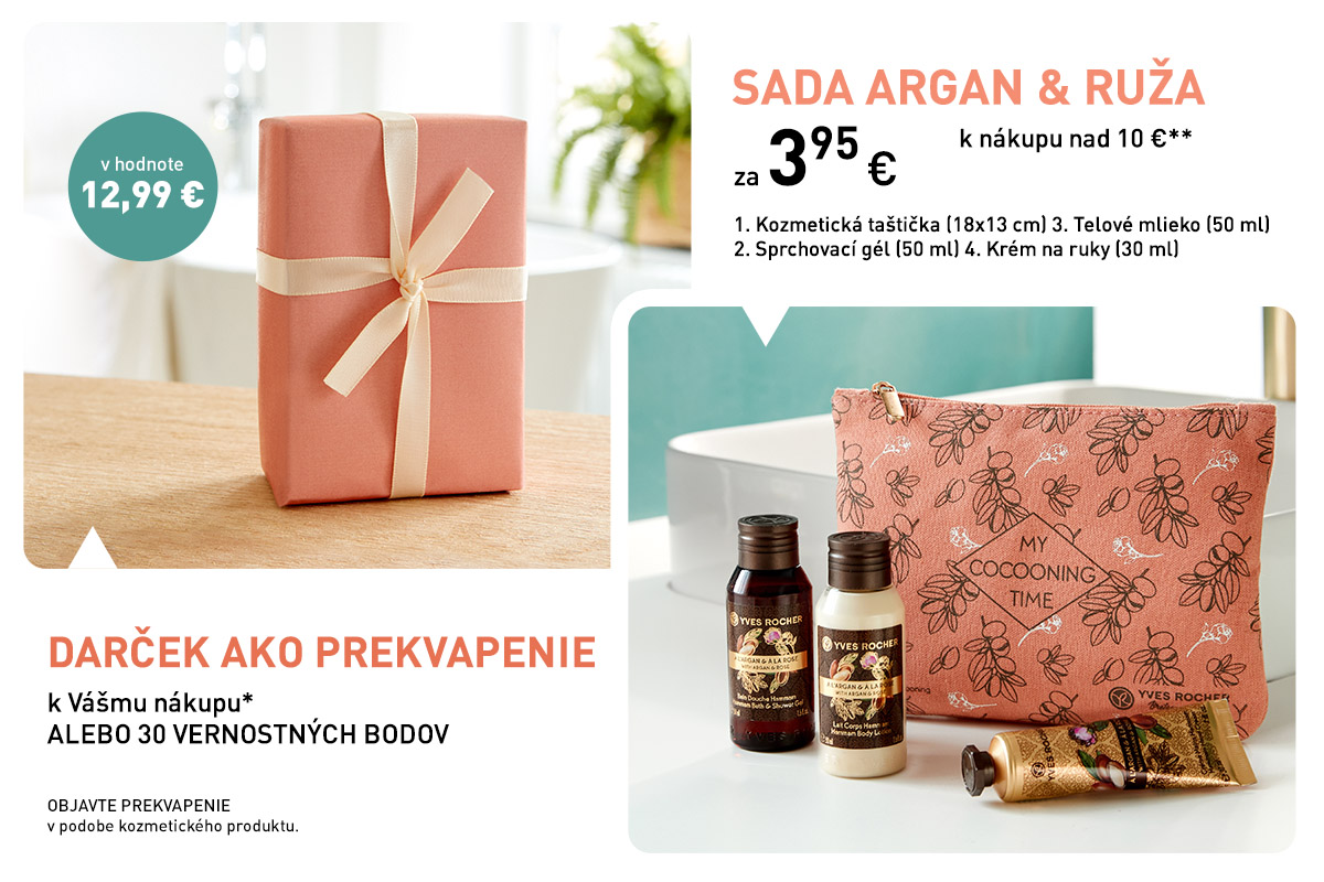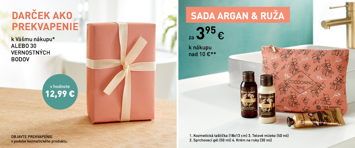 *Jedno prekvapenie alebo 30 vernostných bodov k nákupu nad 3,79 € na zákazníka. Jedna sada Argan & ruža za 3,95 € k nákupu nad 10 €.