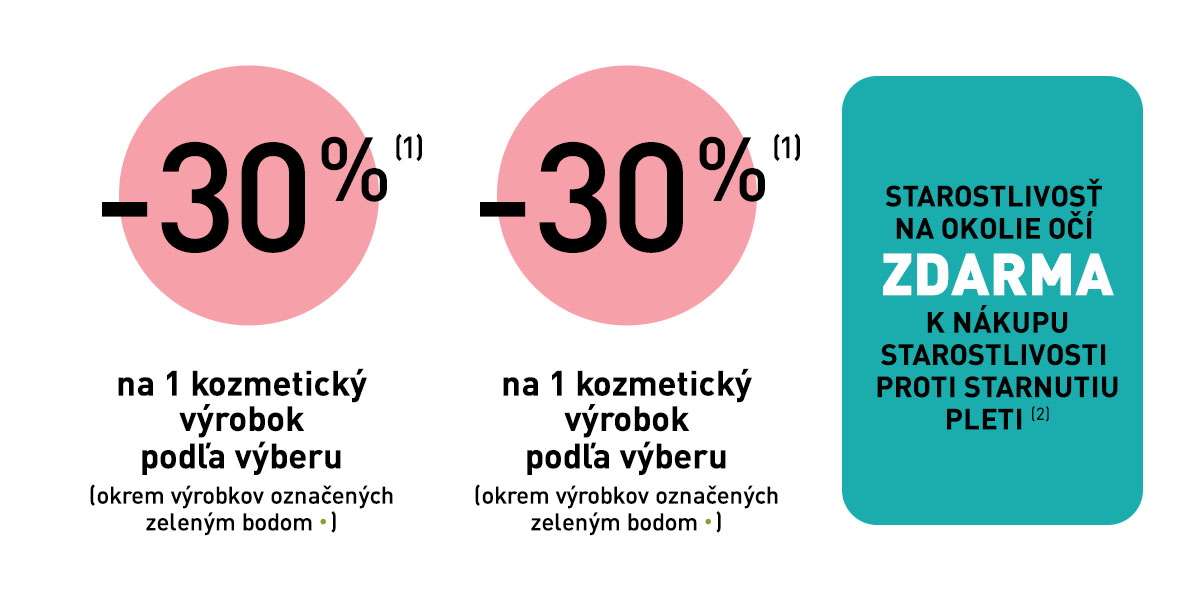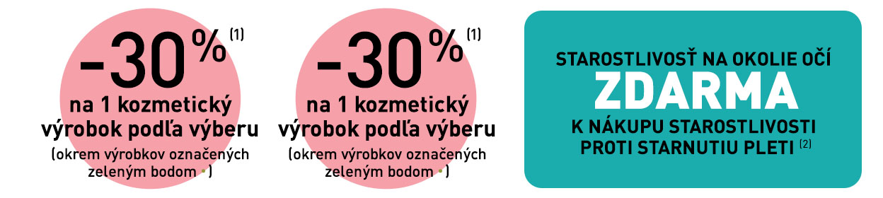 (2) K nákupu starostlivosti proti starnutiu pleti získate jednu starostlivosť na okolie očí z rovnakého radu zdarma. Ponuka sa vzťahuje len na nákup dennej a nočnej starostlivosti, séra alebo starostlivosti o okolie očí z radu proti starnutiu pleti. Ponuka sa nevzťahuje na odličovače, micelárne a čistiace gély, krémy na ruky, balzamy na pery a telové balzamy. Ponuka platí do vydania zásob.