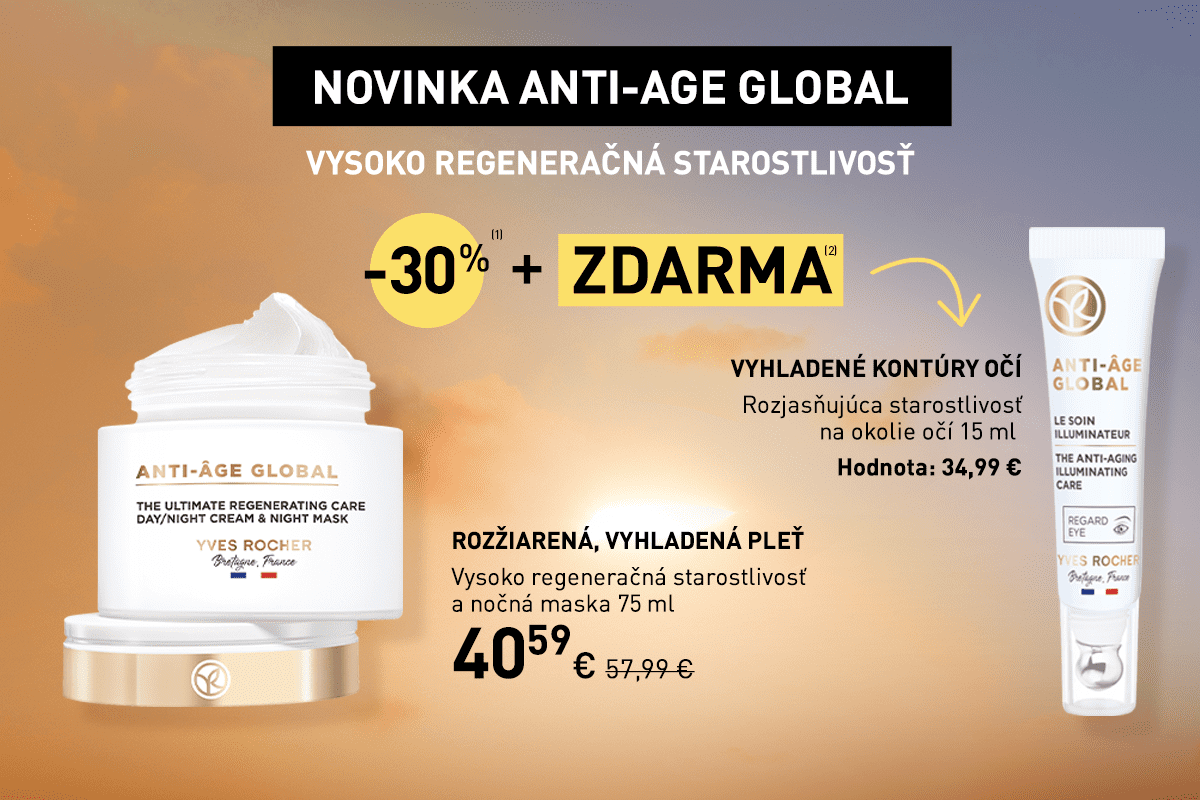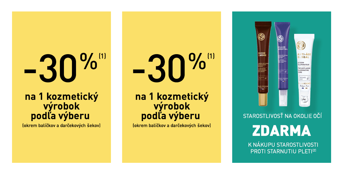 *Zľavy a ponuky sa nekumulujú. Jeden Svieži čistiaci gél, 125 ml alebo jedna kozmetická taštička alebo 15 vernostných bodov k nákupu nad 9,80 € na zákazníka. Ponuka platí do vydania zásob na základe predloženia letáka a Vernostnej karty Yves Rocher počas nákupu. Zmena darčeka vyhradená. Ponuky z letáka je možné uplatniť len jedenkrát. Leták nie je možné uplatniť po platnosti. Všetky zľavy sa vypočítavajú zo základných cien pred zľavou odporučených v SR od 31.1.2024. Ponuka je platná do 31. 3. 2024.
