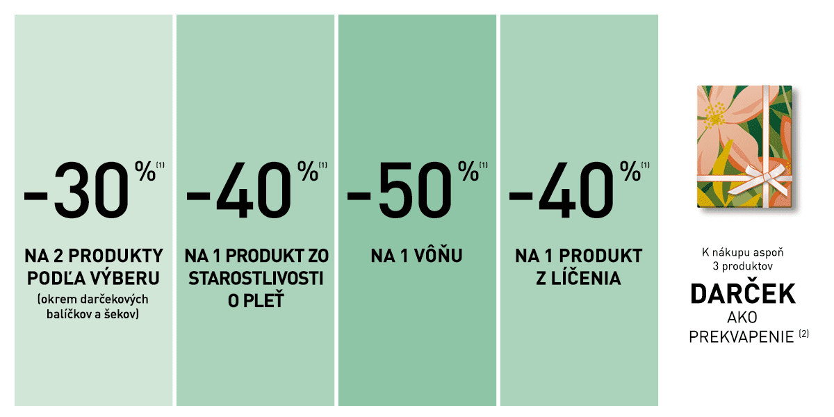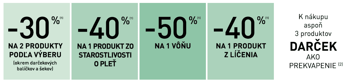 (1) Zľavy a ponuky sa nekumulujú. Ponuka sa nevzťahuje na balíčky a darčekové šeky.