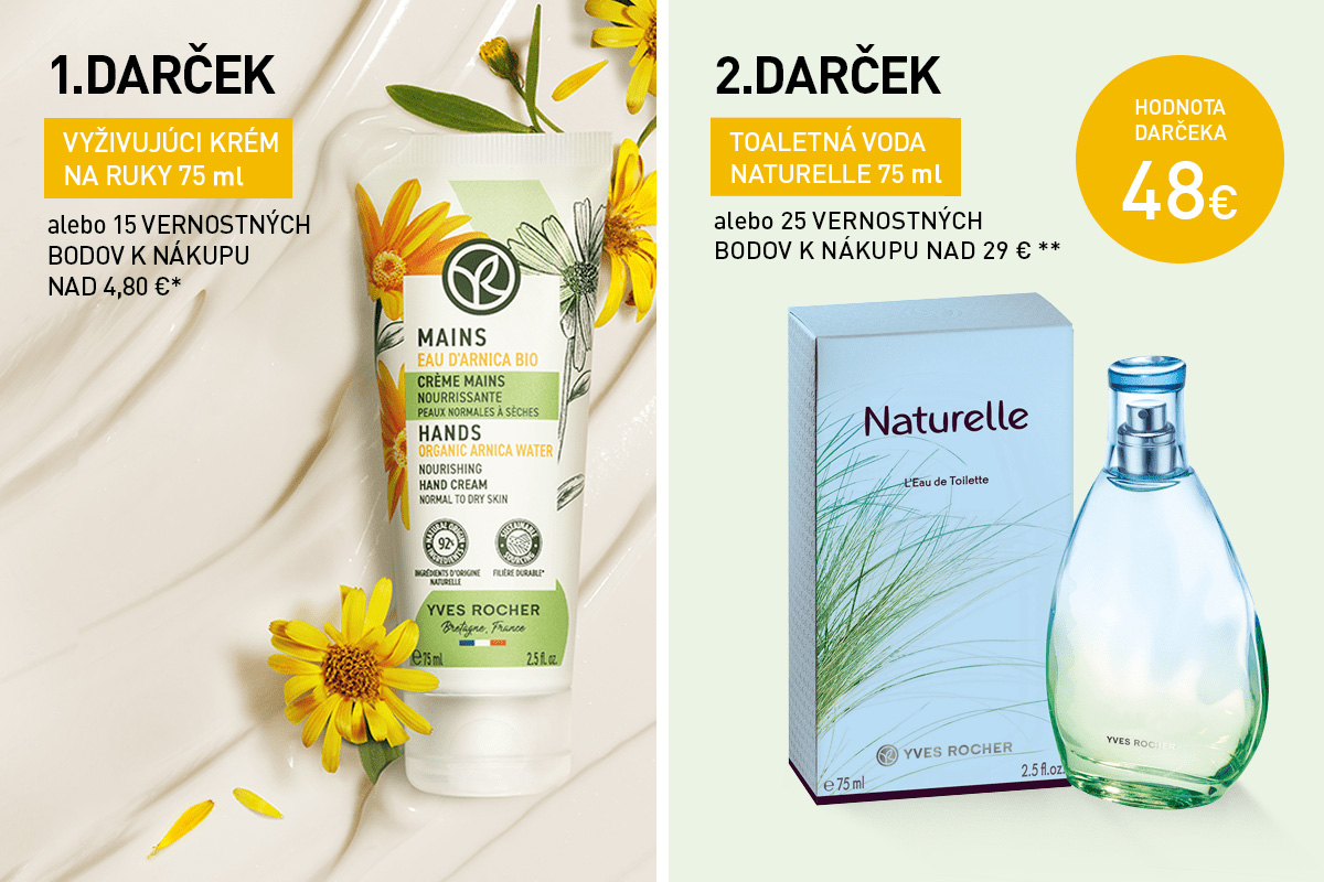 ** Zľavy a ponuky sa nekumulujú. Jedna Toaletná voda Naturelle 75 ml alebo 25 vernostných bodov k nákupu nad 29 € na zákazníka.Ponuka platí do vydania zásob. Zmena darčeka vyhradená.
