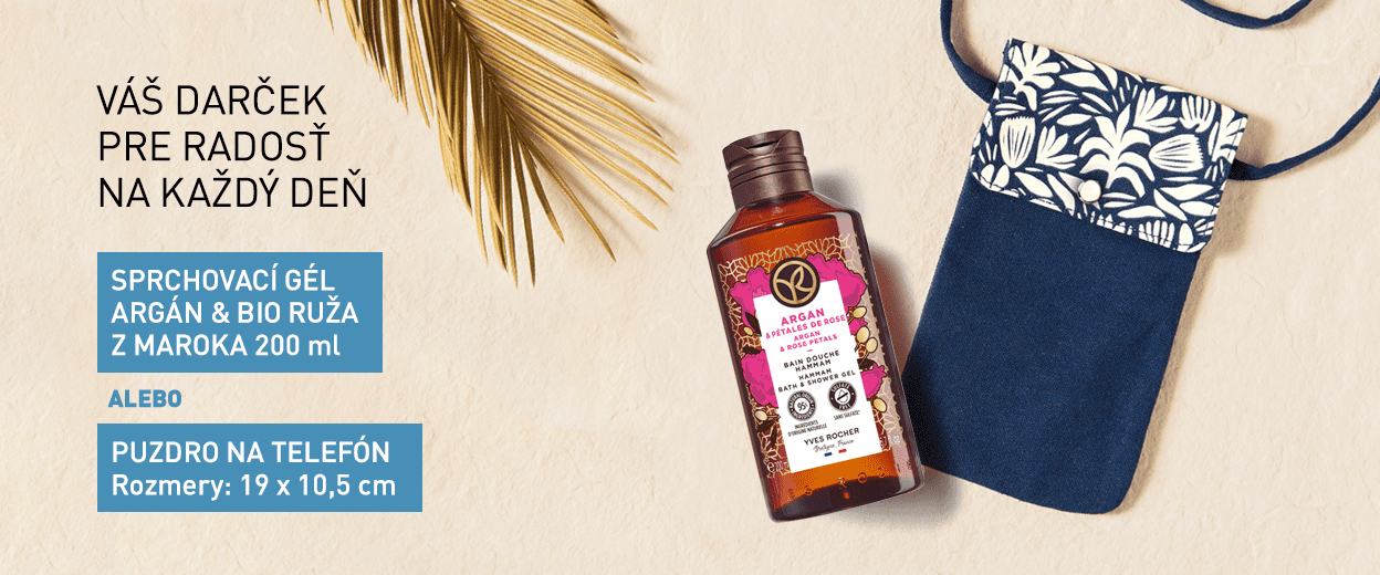 *Zľavy a ponuky sa nekumulujú. Jeden sprchovací gél Argán & bio ruža z Maroka alebo Puzdro na telefón alebo 15 vernostných bodov k nákupu nad 4,80 € na zákazníka. Ponuka platí do vydania zásob na základe predloženia tohto letáka a Vernostnej karty Yves Rocher počas nákupu. Zmena darčeka vyhradená. Darčeky budú vydané len raz. Všetky zľavy sa vypočítavajú zo základných cien pred zľavou odporučených v SR od 31.1.2024. Ponuka je platná do 31. 5. 2024.