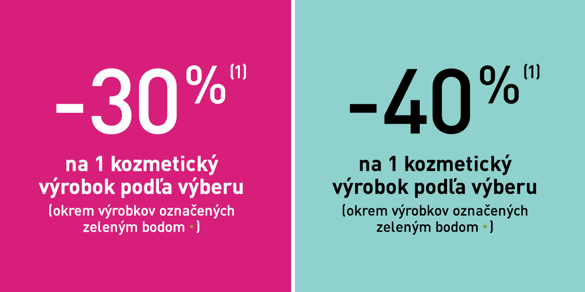 (1) Zľavy a ponuky sa nekumulujú. Ponuka sa nevzťahuje na výrobky označené zeleným bodom •. Darčeky budú vydané len raz. Všetky zľavy sa vypočítavajú zo základných cien pred zľavou odporučených v SR od 3. 4. 2023.