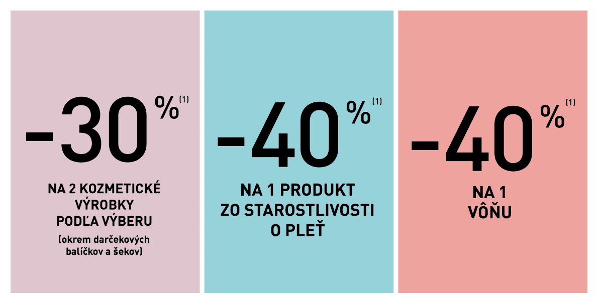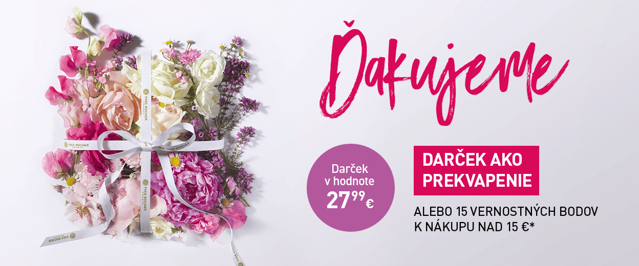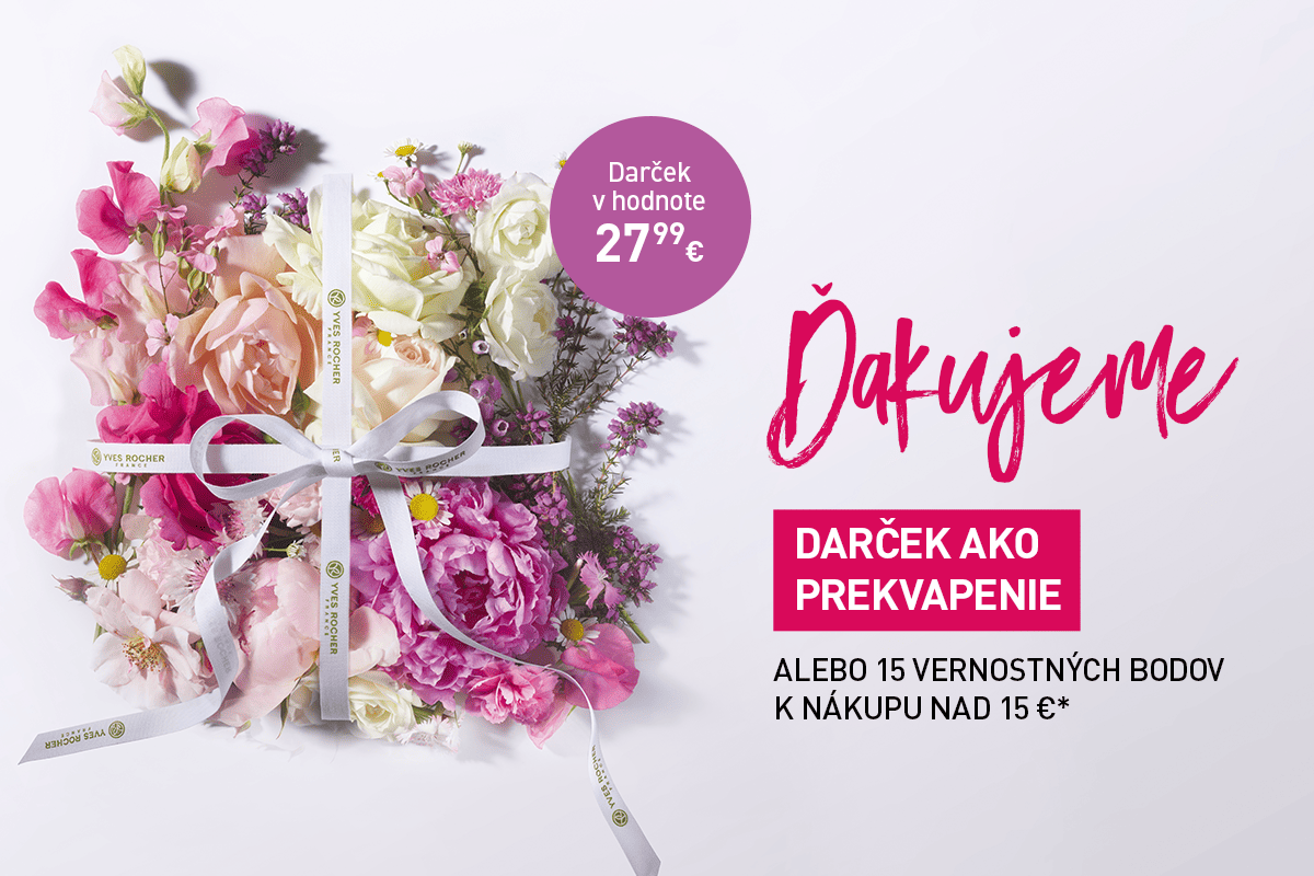 *Zľavy a ponuky sa nekumulujú. Jeden darček ako prekvapenie alebo 15 vernostných bodov k nákupu nad 15 € na zákazníka. Ponuka platí do vydania zásob. Zmena darčeka vyhradená. Všetky zľavy sa vypočítavajú zo základných cien pred zľavou odporučených v SR od 1. 1. 2024. Ponuka je platná do 30. 6. 2024.