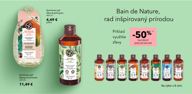 (2) Pri nákupe 2 produktov z radu Bain de Nature za katalógovú cenu získate zľavu 50 % na druhý produkt z radu Bain de Nature. Zľavu 50 % je možné uplatniť na druhý rovnaký alebo v lacnejšej hodnote. Zľava platí len na produkty z radu Bain de Nature.