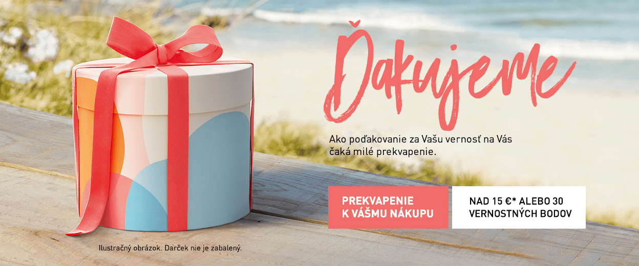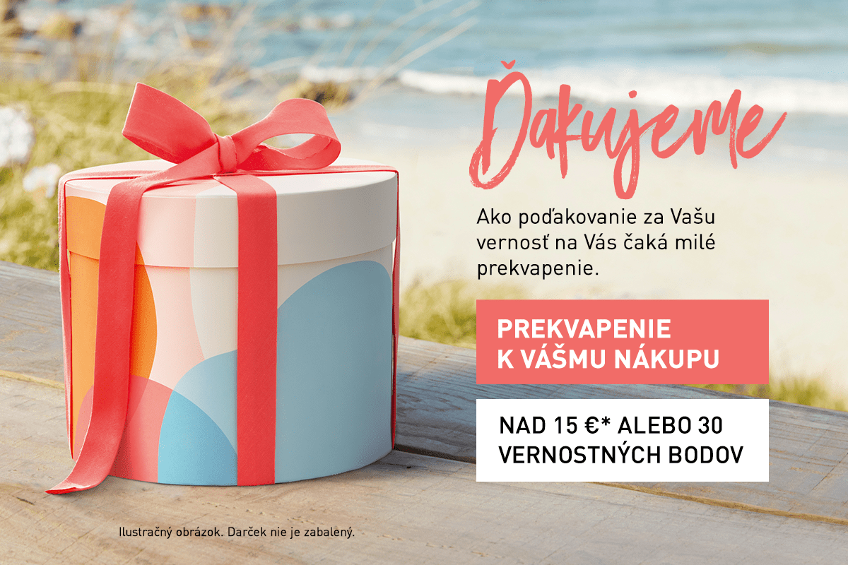 *Zľavy a ponuky sa nekumulujú. Jedno prekvapenie alebo 30 vernostných bodov k nákupu nad 15 € na zákazníka. Ponuka platí do vydania zásob. Zmena darčeka vyhradená.