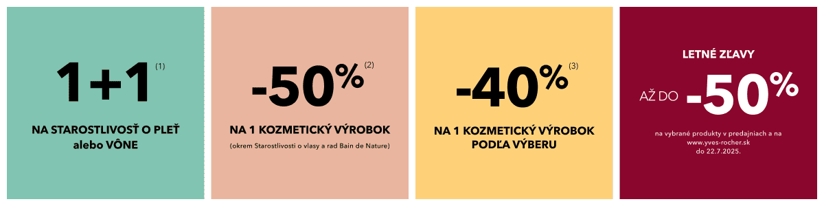 Darčeky budú vydané len raz. Zmena darčekov vyhradená. Všetky zľavy sa vypočítavajú zo základných cien pred zľavou odporučených v SR od 24.7.2024. Ponuky z letáka sa v internetovom obchode môžu líšiť. Ponuka platí v kamenných predajniach Yves Rocher v SR, na e-shope www.yves-rocher.sk alebo v mobilnej aplikácii do 31. 7. 2025.