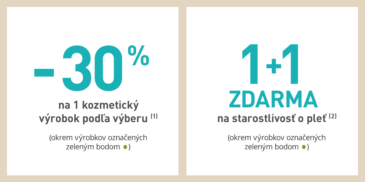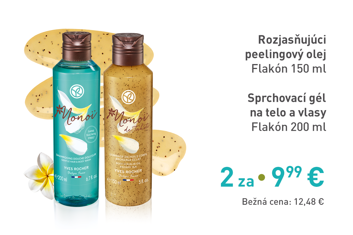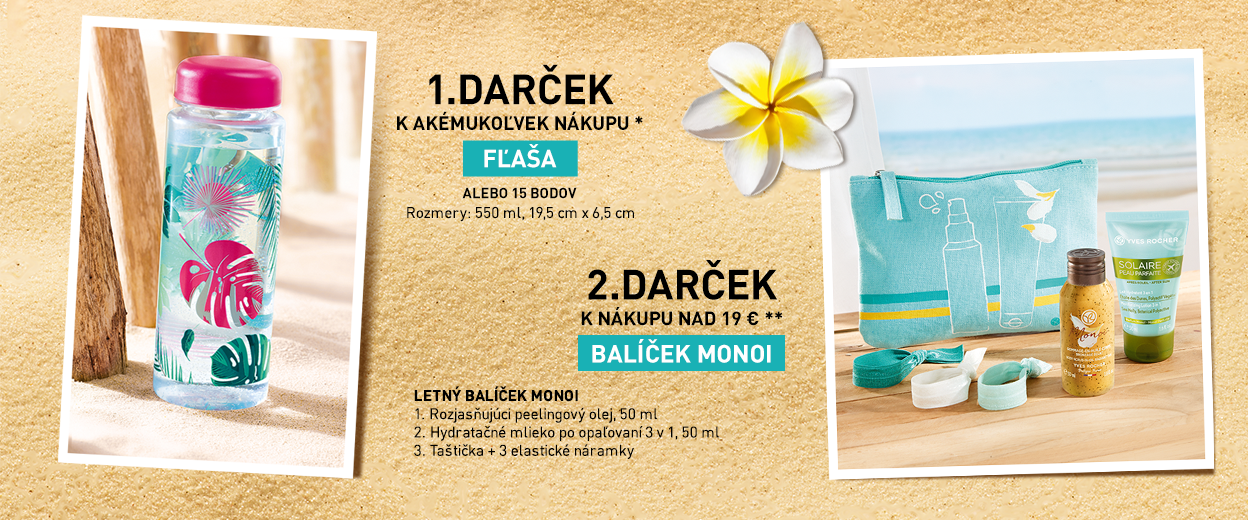 *Jedna fľaša alebo 15 vernostných bodov k nákupu nad 3,79 €. Jeden balíček MONOI alebo 25 vernostných bodov na zákazníka k nákupu nad 19 €. Ponuka platí do vydania zásob. Zmena darčeka vyhradená. Darček bude vydaný len raz. Newsletter nie je možné uplatniť po platnosti. Ponuka platí v kamennych predajniach a v internetovom obchode do 31.8.2021. Ponuku nie je možné kombinovať a kumulovať s inými akciami. Pred potvrdením objednávky si prosím skontrolujte, či sa zľava načítala. V opačnom prípade sa akčná ponuka neuplatnila. Keď využijete ponuku tohto mailingu, nie je možné vkladať darčeky z ponuky e-shopu. Na ponuku mailingu sa nedá uplatniť vernostná zľava.