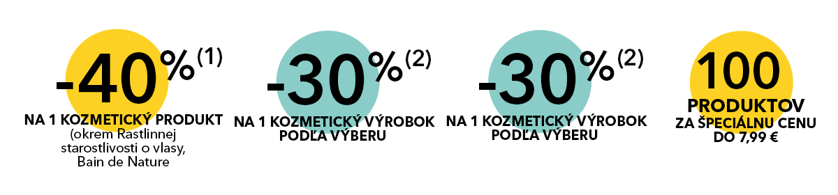 (1) Zľava sa nevzťahuje na produkty z radu Bain de Nature (sprchovacie gély, telové mlieka, peelingy, krémy na ruky, balzamy na pery, tekuté mydlá, tuhé mydlá, oleje, parfumované spreje), rastlinnej starostlivosti o vlasy, balíčky, darčekové šeky a miniatúry produktov.