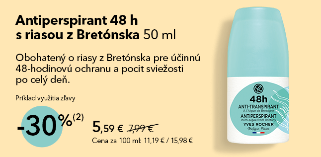 Darčeky budú vydané len raz. Zmena darčekov vyhradená. Všetky zľavy sa vypočítavajú zo základných cien pred zľavou odporučených v SR od 24.7.2024. Ponuky z letáka sa v internetovom obchode môžu líšiť. Ponuka platí v kamenných predajniach Yves Rocher v SR po predložení tohto letáka a v internetovej predajni www.yves-rocher.sk do 31. 8. 2025.