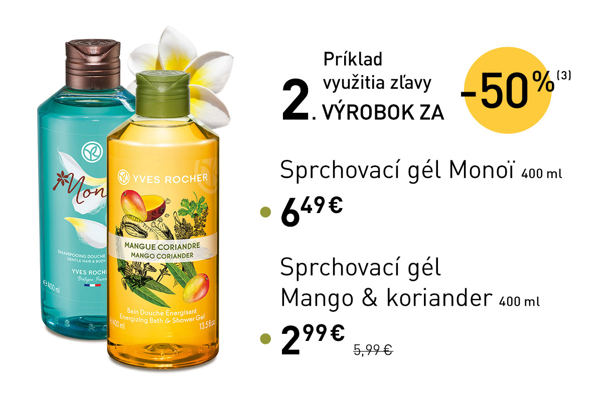 (3) Zľavy a ponuky sa nekumulujú. Ponuka sa vzťahuje na Sprchovacie gély 400 ml PLAISIRS NATURE (rôzne vône) a Sprchovací gél 400 ml MONOI. Zľava bude uplatnená na druhý produkt v nižšej alebo rovnakej hodnote.