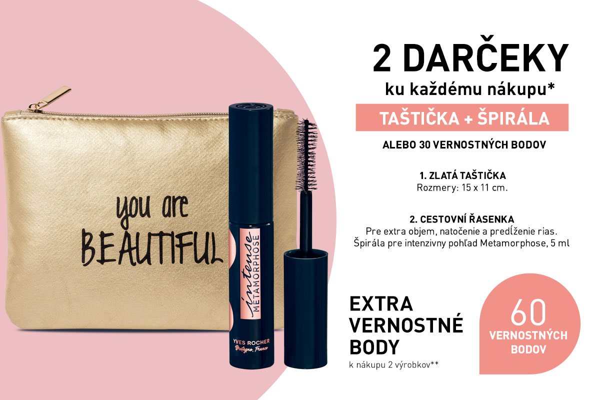 *Jedna zlatá taštička a cestovná špirála pre intenzívny pohľad Metamorphose, 5 ml alebo 30 vernostných bodov k nákupu nad 3,79 € na zákazníka. **Ponuku 60 vernostných bodov na zákazníka k nákupu dvoch produktov je možné využiť len raz. Ponuka platí do vydania zásob. Zmena darčeka vyhradená. Darček bude vydaný len raz. Newsletter nie je možné uplatniť po platnosti. Ponuka platí v kamennych predajniach a v internetovom obchode do 31.10.2021. Ponuku nie je možné kombinovať a kumulovať s inými akciami. Pred potvrdením objednávky si prosím skontrolujte, či sa zľava načítala. V opačnom prípade sa akčná ponuka neuplatnila. Keď využijete ponuku tohto mailingu, nie je možné vkladať darčeky z ponuky e-shopu. Na ponuku mailingu sa nedá uplatniť vernostná zľava.