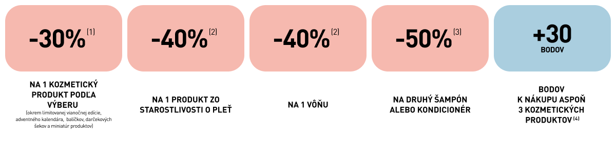 (2) Zľavy a ponuky sa nekumulujú. Ponuka sa nevzťahuje na balíčky, darčekové šeky a miniatúry produktov. Ponuka platí len na nákup produktov z kategórie Starostlivosť o pleť a Parfumy.