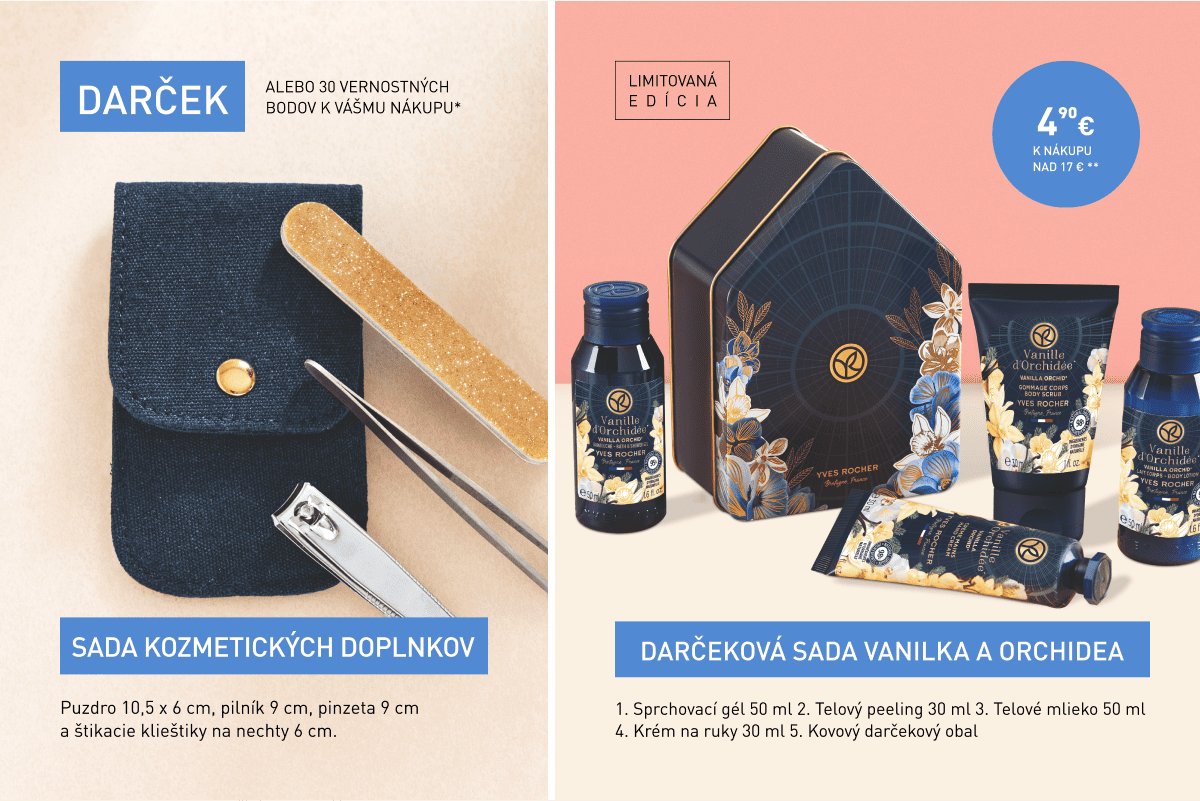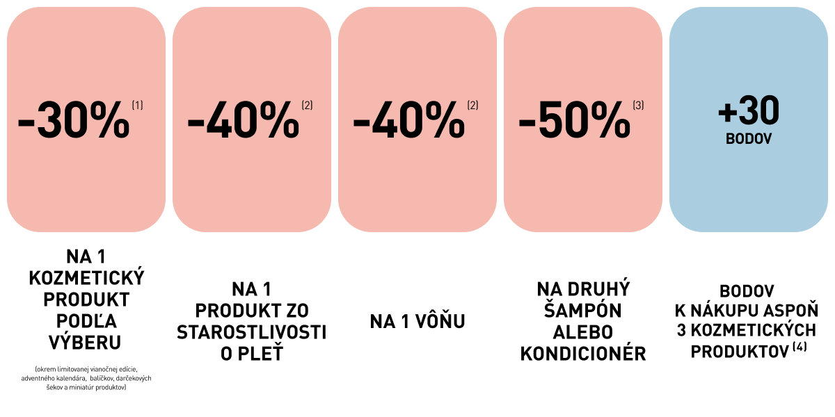 *Zľavy a ponuky sa nekumulujú. Jedna Sada kozmetických doplnkov alebo 30 vernostných bodov k nákupu nad 4,80 € na zákazníka.