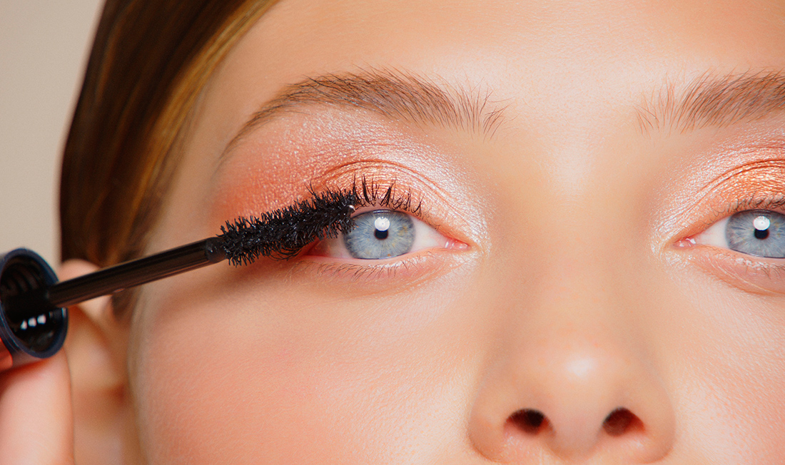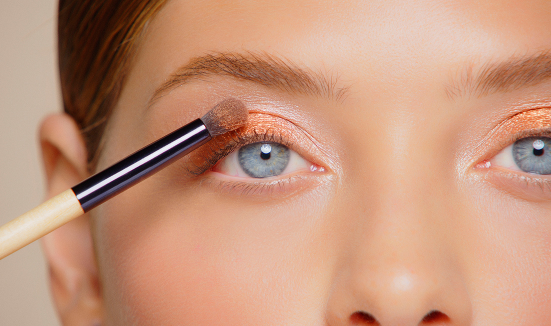 Začnite nanesením trblietavých očných tieňov s oranžovým nádychom na celé pohyblivé viečko až k vonkajšiemu kútiku oka a pozdĺž rias na spodnom viečku. My sme pri líčení použili odtieň Crépuscule z limitovanej Palety očných tieňov pre zimné líčenie.
